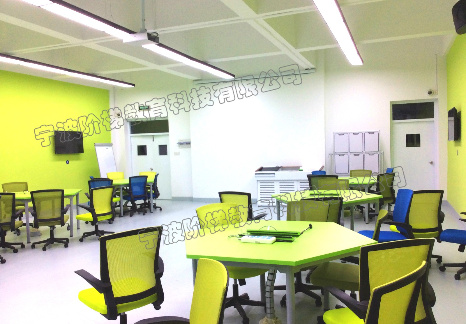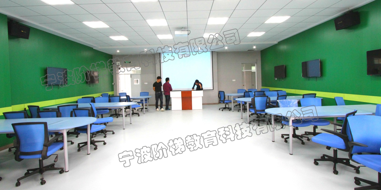 9號(hào)教學(xué)樓三樓是翻轉(zhuǎn)課堂的專門教學(xué)區(qū)域,淺綠色的教室墻壁掛著大屏幕投影儀,8張長約3米,寬約1.5米的果綠色固定課桌,每張課桌旁都掛著一臺(tái)小電視,上面能清晰看到投影儀上的內(nèi)容。白色的講臺(tái),綠色的桌子,藍(lán)色的轉(zhuǎn)椅,顏色搭配清新干凈。藍(lán)色的轉(zhuǎn)椅可自由轉(zhuǎn)動(dòng),學(xué)生上課時(shí)能溫馨地圍坐在一起,還可以自由轉(zhuǎn)動(dòng)到別的課桌討論問題,這就是大紅鷹學(xué)院的“翻轉(zhuǎn)課堂”教室。